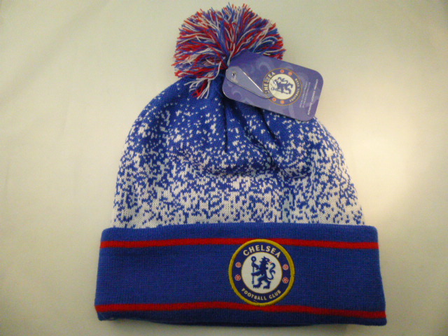 An Official Chelsea FC Knit Cuff Beanie with a Red, White, and Blue Pom Pom. Red, White, and Blue Colors.