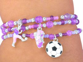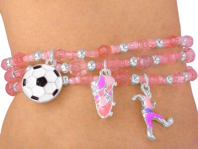 A Triple Strand Children’s Soccer Bracelet. Each Strand Dangles One Charm: a Shoe, Soccer Ball, or Soccer Player. Lead and Nickel Free. Available in Light Blue, Amethyst, Pink, or Multi-Colored.