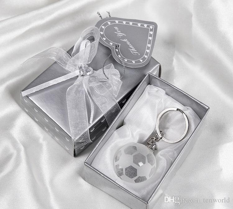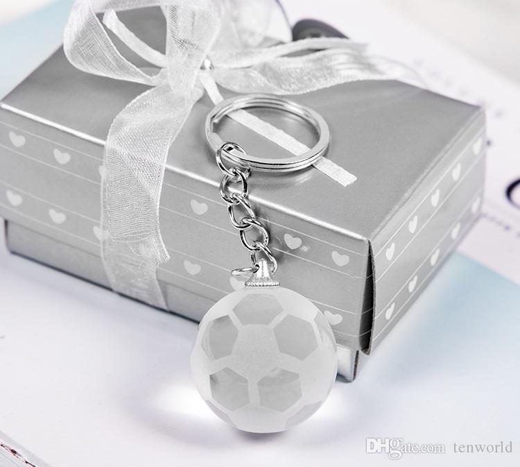 A crystal soccer ball key-chain in a silver padded gift box with a white bow. The ball is about 1 1/8″. The chain and key ring are silver.