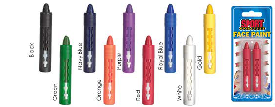 2 Sticks Per Pack of Colored Face Paint. The nine colors include Black, Green, Navy, Orange, Purple, Red, Royal Blue, White, and Gold