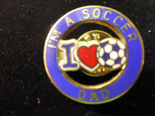 I’m a Soccer Dad 1 Inch gold finish Cloisonné Pin with clasp attachment.