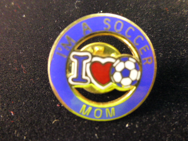 I’m a Soccer Mom 1 Inch gold finish Cloisonné Pin with Clasp Attachment.