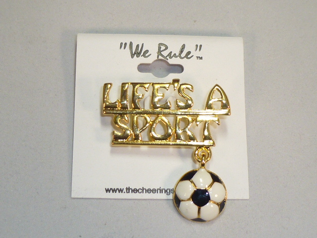 Life’s A Sport Soccer Pin – Gold lettering with a black, white, and gold soccer ball. Needle clasp on back.
