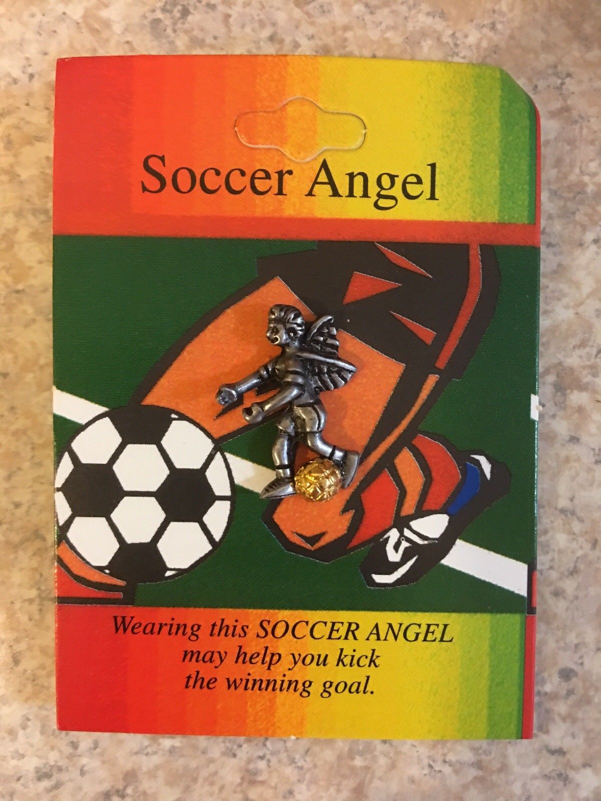 Soccer Angel Pins, each card reads “wearing this Soccer angel may help you kick the winning goal!”