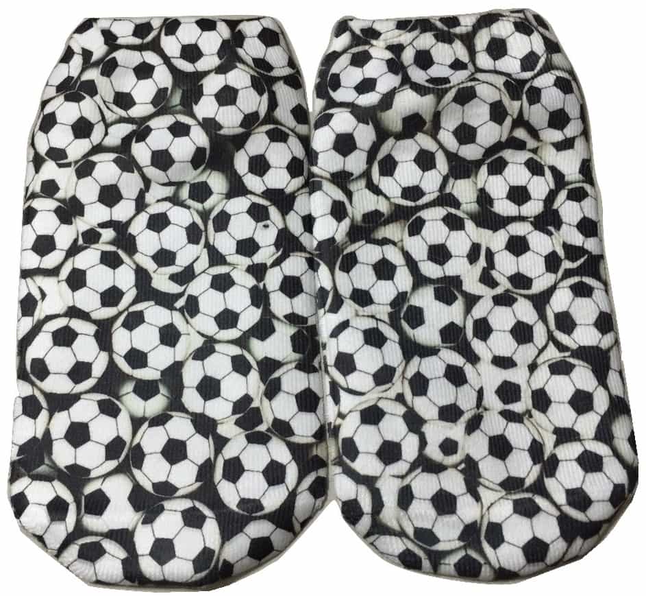 Soccer Ankle Socks – One size Fits Most – 100% Polyester. Black and White graphics with some slight antique accents.