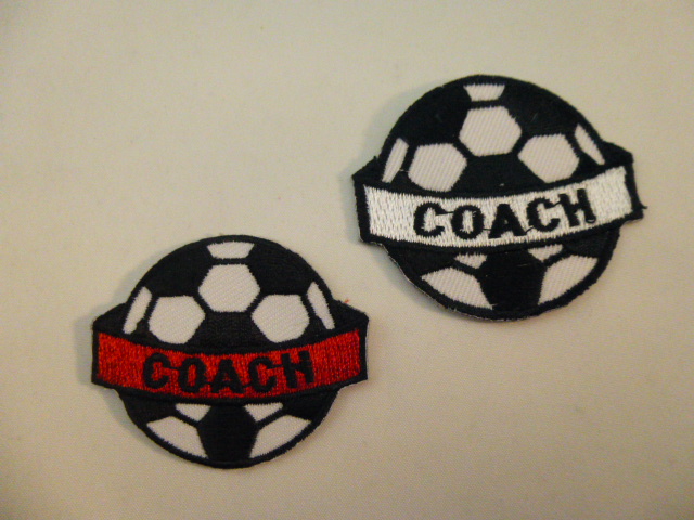 Soccer Coach Embroidered Patch, about 2″ x 2″. Available with a red or white banner. Can be sewed on or heat transferred at high heat.