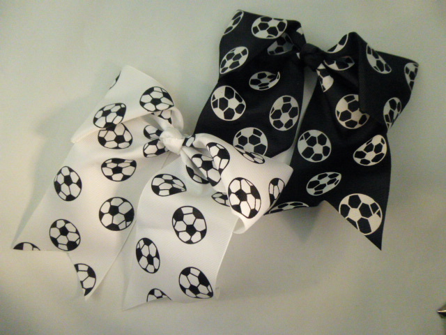 Hair Bow Jumbo Cheer Type Bow Soccer Sport Grosgrain Bowtie. Long Tail. SoccerAlligator Clip. Bow-7″x 6″. Available in white with black balls and black with white balls.