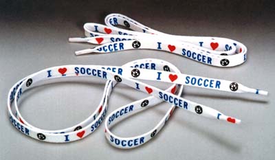 A quality pair of 40″ soccer shoes laces. Printed on the laces in 3 colors is “I (heart) Soccer” with a soccer ball.