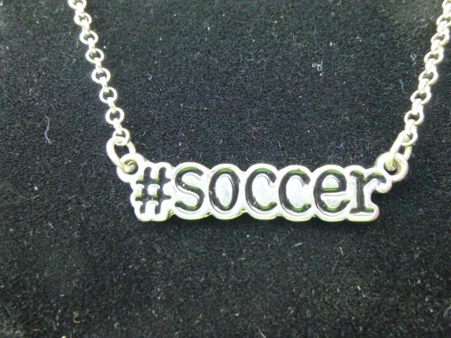 A Youth #SOCCER Necklace in silver with black in-filled letters. The link-chain is 18″ long. The #SOCCER charm is about 1″ x 1/4″.